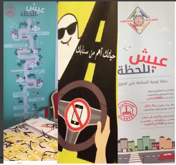 شارك قسم التميز المؤسسي في مجموعة الساير مؤخرًا في حملة التوعية بالقيادة الامنة الخاصة بشركة نفط الكويت بمناسبة اليوم العالمي لتذكر ضحايا الحوادث المرورية . و تأتي هذه المبادرات الاجتماعية كجزء من التزام الساير الثابت في تطوير سلوكيات قيادة امنة و مسؤولة من خلال حملات “عيش اللحظة” ، و هو برنامج لتنبيه السائقين لاتباع تدابير بسيطة في القيادة و لكن مهمة مثل ارتداء حزام الامان ، تجنب استخدام الموبايل ، عبور الاشارة الحمراء ، القيادة بسرعة ، القيادة المتهورة ، الخ .