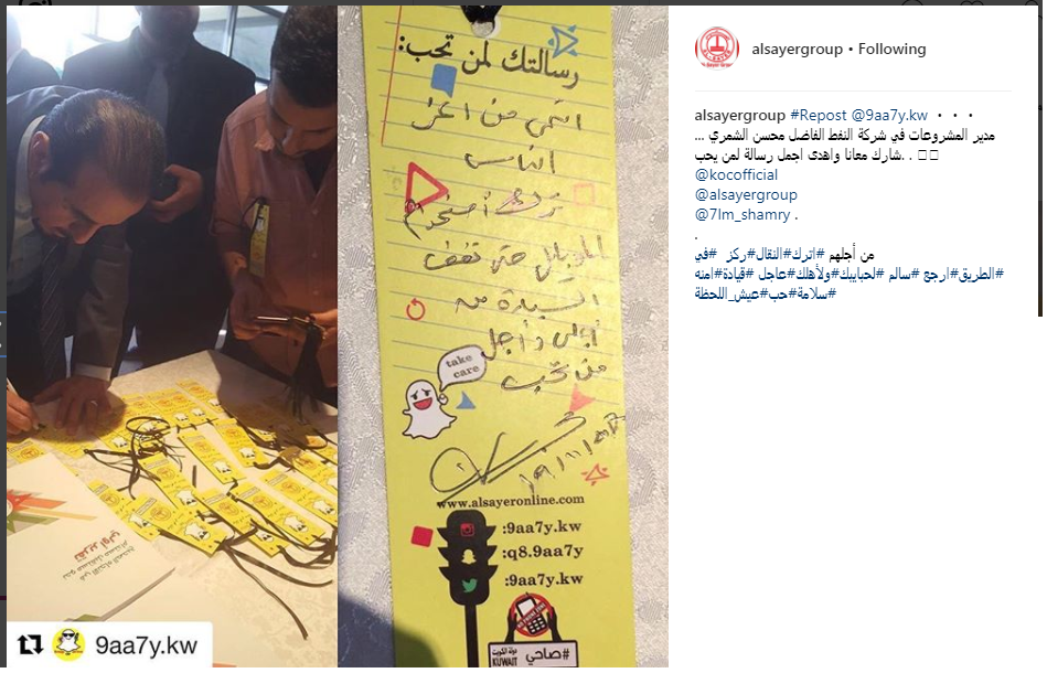 عبر فريق شركة نفط الكويت و فريق الصحة و السلامة و البيئة و مجموعة ” Well Surveillance” عن تقديره لحضور مجموعة الساير و الشريك غير الحكومي صاحي ((@9aa7y.kw لتقديم رسالة مهمة و حساسة مفادها تجنب التصوير ببرنامج سناب شات اثناء القيادة و أن كل شخص مسؤول عن القيام بالخيار الصحيح .